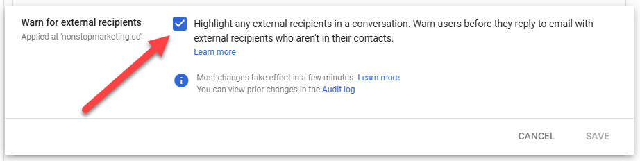 If you need custom “tripwire” behavior (banner, route to review mailbox), use Gmail compliance content filtering rules.