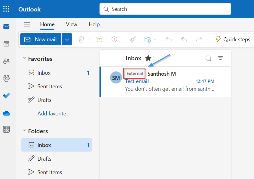 Verify: send an email from outside the tenant and confirm the external sender callout appears in Outlook.