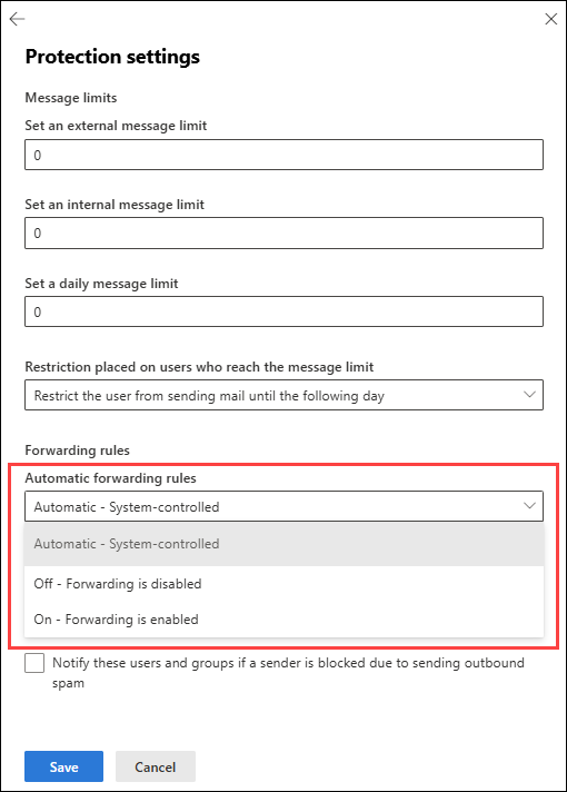 Microsoft explicitly calls out that outbound spam policies control both Inbox rules forwarding and mailbox (SMTP) forwarding, and documents the three settings: